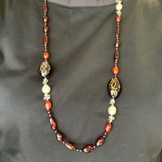 蒔絵を施したジンセンに淡水パールや天然石を散りばめた琥珀ロングネックレスです♪